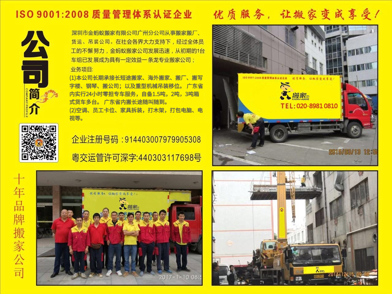 深圳市金蚂蚁搬家有限公司(注册资金1000万,企业注册号码:440301103011399;国税字:440300797990530号;粤交运管许可深字:440303117698号)是深圳市一家从事的搬屋公司。成立于1995年,是深圳市成立较早的深圳搬家公司、深圳搬运公司之一。在社会各界大力支持下,经过全体员工的不懈努力,我司搬家发展迅速,从初期的几个车组已发展成为具有一定效益一条龙深圳搬家公司,所有员工均受过系统培训。